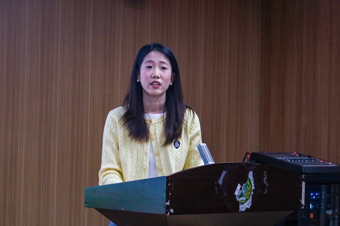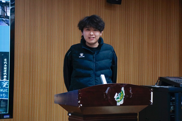社会实践先进个人代表任豫阳上台发言,他结合自身实践经历,分享了在实践过程中的收获与感悟。他回顾了深入基层调研的点滴细节,生动讲述与群众互动、参与社区服务、解决实际问题的难忘体验。他表示,社会实践让他拓宽了视野、增强了责任感,并鼓励更多同学积极参与实践活动,在服务社会中实现自我成长。