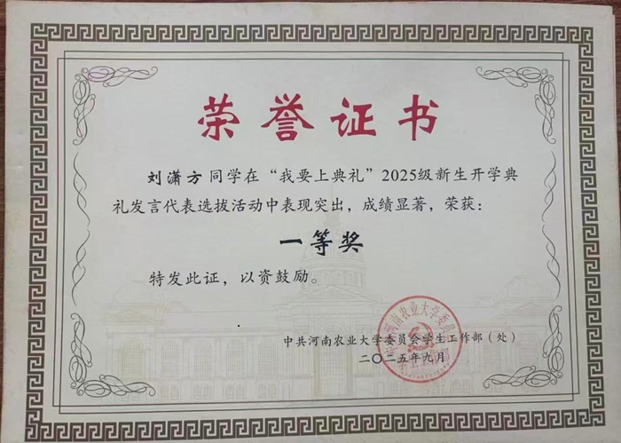新生刘潇方荣获开学典礼发言代表选拔活动个人一等奖