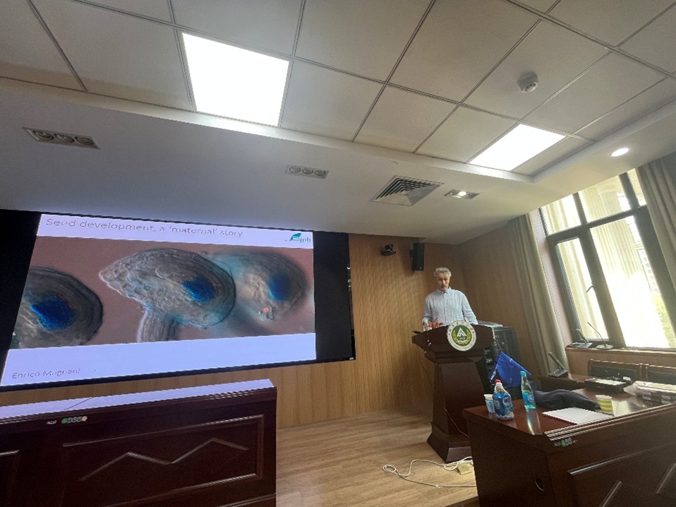 Enrico Magnani研究员以“Seed development: a maternal story”为题,系统介绍了其课题组在种子发育领域取得一些系列重要研究成果,尤其重点阐述了植物种子发育过程中母本珠心组织的细胞命运改变在种子进化的特殊作用。报告结束后Enrico研究员与学院师生展开热烈讨论,并积极鼓励我校学生到INRAE开展学习交流及攻读博士学位,提升国际合作水平。