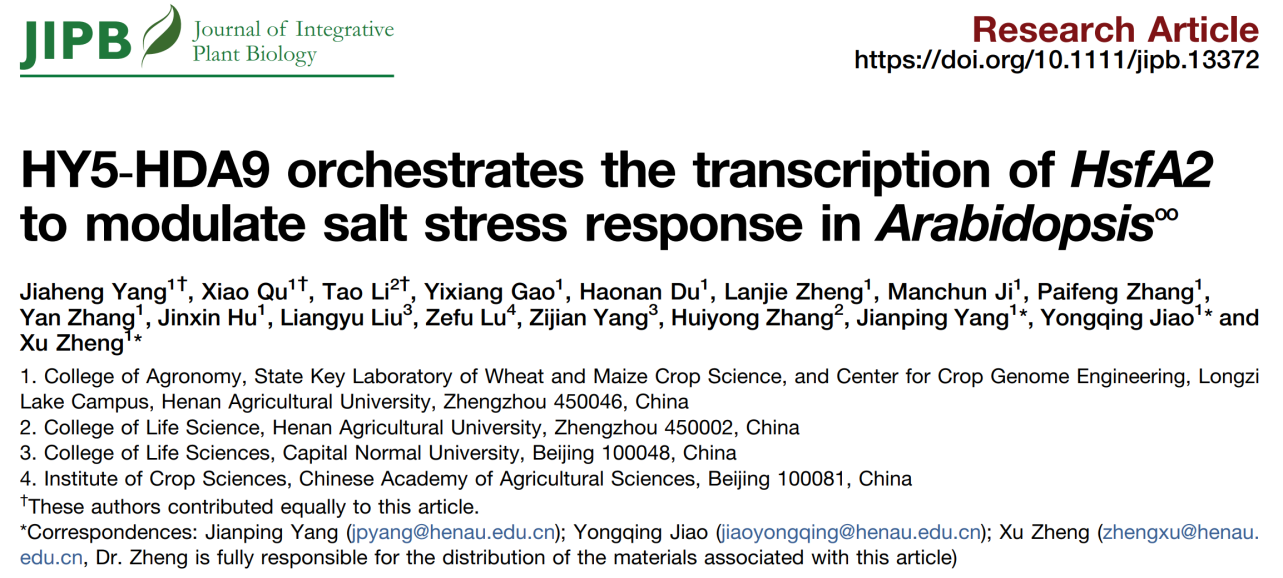 作物基因组与分子育种中心郑旭教授团队、矫永庆教授团队和杨建平研究员团队联合解析了光信号在调控植物盐胁迫反应的分子机制。该研究成果以题为“HY5-HDA9 orchestrates the transcription of HsfA2 to modulate salt stress response in Arabidopsis”在线发表在植物学知名学术期刊Journal of Integrative Plant Biology(2022, doi:10.1111/jipb.13372.2023, IF:9.106)上。郑旭教授、矫永庆教授和杨建平研究员为共同通讯作者;博士研究生杨家蘅、硕士生曲晓和生命科学院教师李涛为共同第一作者。张会勇教授,硕士研究生高义翔,杜昊南也为此项工作做出重要贡献。