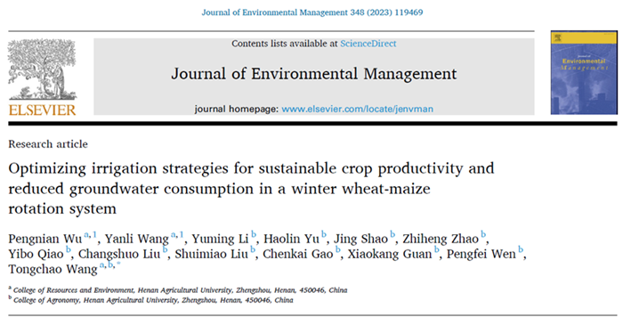 近日,该研究成果以“Optimizing irrigation strategies for sustainable crop productivity and reduced groundwater consumption in a winter wheat-maize rotation system”为题发表在环境管理TOP期刊《Journal of Environmental Management》(中科院一区,IF=8.7)。