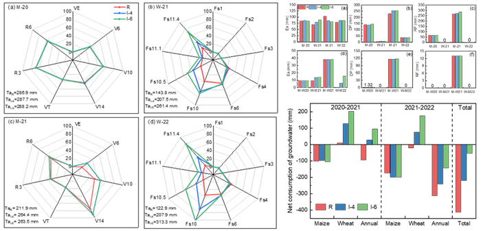 本研究在冬小麦-夏玉米周年轮作的基础上,在冬小麦设置三种灌溉策略,当40厘米层土壤含水量降至40%FC(约在拔节期左右),I-4,灌溉持续到40厘米土层的土壤含水量达到60% FC;I-6,灌溉持续到60厘米土层的土壤含水量达到80% FC。当土壤含水量下降到设定水平时进行再次灌溉。雨养处理(R)为对照,不进行灌溉处理。为了进一步探究农田水分消耗情况,引入WHCNS (Water Heat Carbon Nitrogen Simulator) 模型对农田水分消耗分量进行模拟。研究结果表明,I-4处理能够减少灌溉投入和田间水分损失,提高作物水分生产力,降低地下水的消耗,同时与I-6处理相比,保持作物产量。虽然雨养处理导致产量显著降低,但可以显著增加地下水的补给。相反,I-6处理导致大量田间水损失,并呈现最低的作物水生产率。从年度可持续性的角度来看,I-4处理平衡了作物产量和地下水消耗,实现了在不同降水年份下的可持续发展。这对于黄淮海平原周年作物轮作系统内可持续农业的发展是有益的。