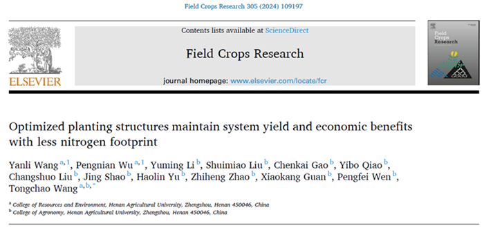 近日,该研究成果以“Optimized planting structures maintain system yield and economic benefits with less nitrogen footprint”为题发表在农学TOP期刊《Field Crops Research》(中科院一区,IF=5.8)。