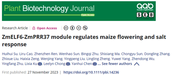 Plant Biotechnology Journal》(影响因子:13.8)上发表题为“ZmELF6-ZmPRR37 module regulates maize flowering and salt response”的研究论文,揭示了ZmPRR37通过光周期途径调控玉米开花时间和通过ABA路径响应盐胁迫的分子机制。