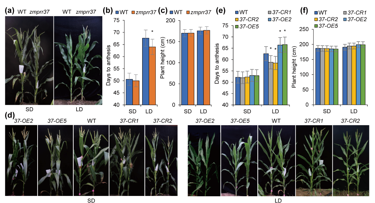 作者通过Ac/Ds转座子和转座子元件扩增子测序技术,鉴定到一个响应光周期开花的突变体zmprr37。长日照条件下,相比于野生型zmprr37突变体开花时间显著提前,而短日照条件下,两者开花时间无显著差异。通过构建了ZmPRR37过表达株系和ZmPRR37基因敲除株系进一步验证了ZmPRR37基因的生物学功能,ZmPRR37是一个光周期敏感基因,在长日照条件下延迟开花(图1)。
