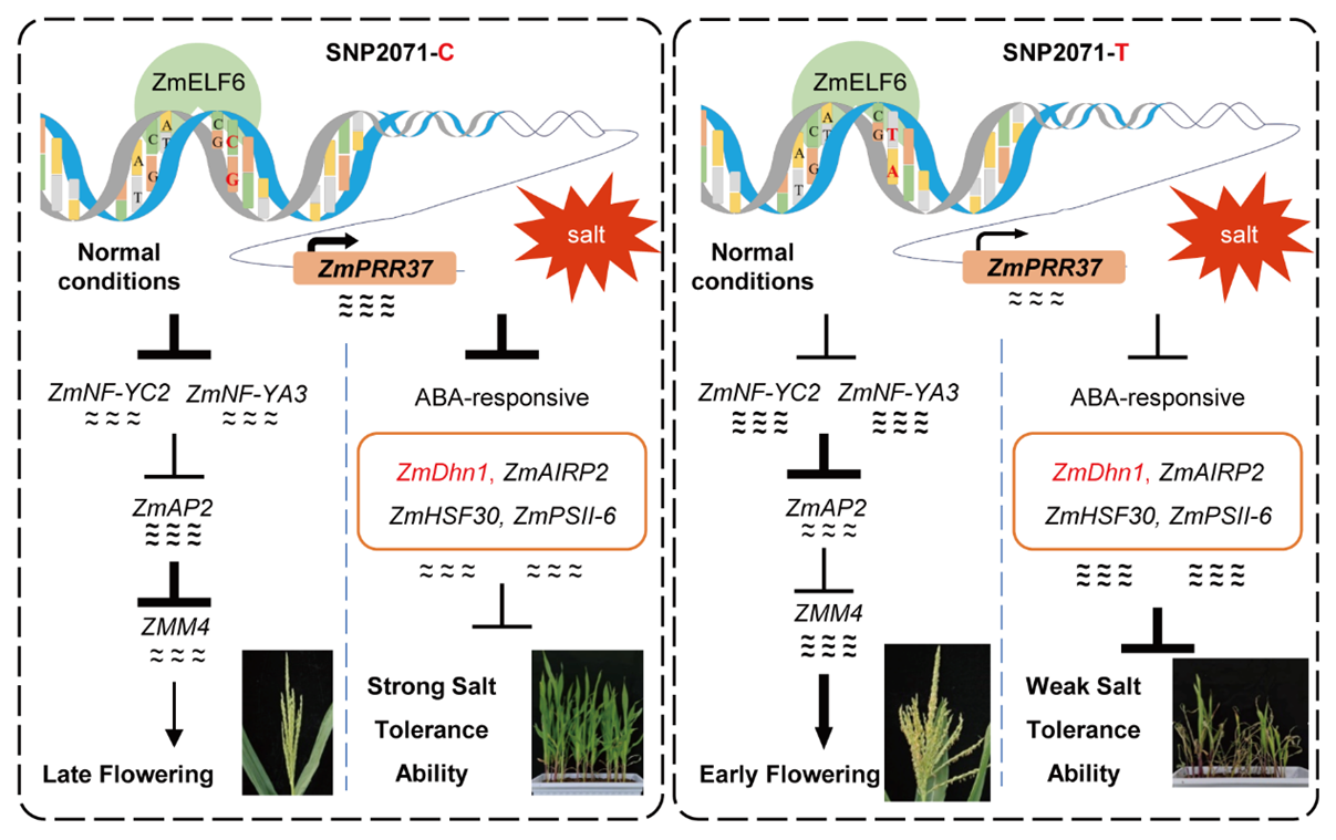 作者通过候选基因关联分析发现,在ZmPRR37基因起始位点上游2071 bp处有一个与开花时间显著相关的SNP(C/T),该SNP位于C2H2型转录因子结合的motif内(ACACC)。利用EMSA实验,证明了C2H2型转录因子ZmELF6对单倍型C(ACACC)的结合能力更强。利用转录活性实验,证明了ZmELF6增强ZmPRR37启动子活性,单倍型C活性明显高于单倍型T(ACACT)。借助DAP-seq、RNA-seq、EMSA等实验,作者获得如下结果:(1)ZmPRR37直接结合ZmNF-YC2和ZmNF-YA3的启动子,抑制其转录进而延迟玉米开花;(2)实验证明ZmDhn1响应ABA,负向调控玉米盐胁迫抗性,ZmPRR37直接结合ZmDhn1的启动子抑制其转录进而增强玉米盐胁迫耐受性。因此该工作揭示了ZmPRR37在玉米中调控光周期开花时间和盐胁迫抗性的双重功能(图3),为全面解析光周期途径调控玉米开花时间的分子机制提供了理论基础,为培育抗盐玉米新品种提供了优良基因资源。