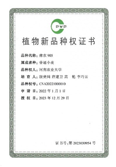 豫农905解决了优质品种不高产、不抗倒和不抗病的矛盾,参加国家统一试验期间表现突出,备受区试主持人、小麦界同行关注,特别是在2024年遭遇大风、干热风胁迫下表现优异,在2024年第七届黄淮麦区小麦新品种地展博览会上入选专家推荐品种名单,再加上2023年12月获国家植物新品种权保护(CNA20221000010),推广前景十分广阔,将为保障国家粮食安全和推进乡村振兴做出积极贡献。
