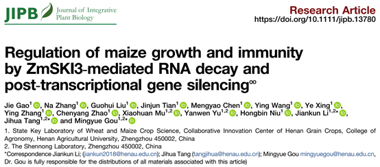 玉米生物技术团队苟明月教授课题组在国际著名学术期刊《Journal of Integrative Plant Biology》在线发表了题为“Regulation of maize growth and immunity by ZmSKI3‐mediated RNA decay and post‐transcriptional gene silencing”的研究论文。该研究发现玉米的生长和抗病性受到转录、mRNA降解和转录后基因沉默(PTGS)三个层次的精细调控,提出了实现玉米生长和抗病平衡的新策略。