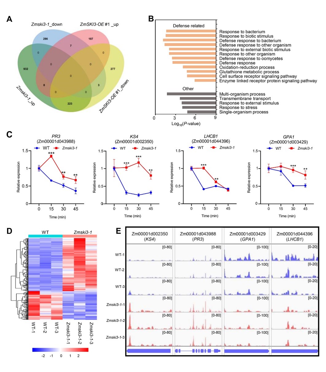 ZmSKI3介导生长和抗病性的内在机制,该研究利用转录组分析,发现抗病防御通路的基因在