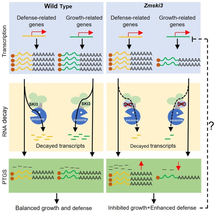 ZmSKI3介导的RNA降解调控以及转录后基因沉默(PTGS)三个层次的调控(图3)。该研究也为利用基因编辑等手段精细调控玉米生长和抗病平衡提供了新的靶标基因,为实现玉米抗病与产量协同提升提供了新策略。