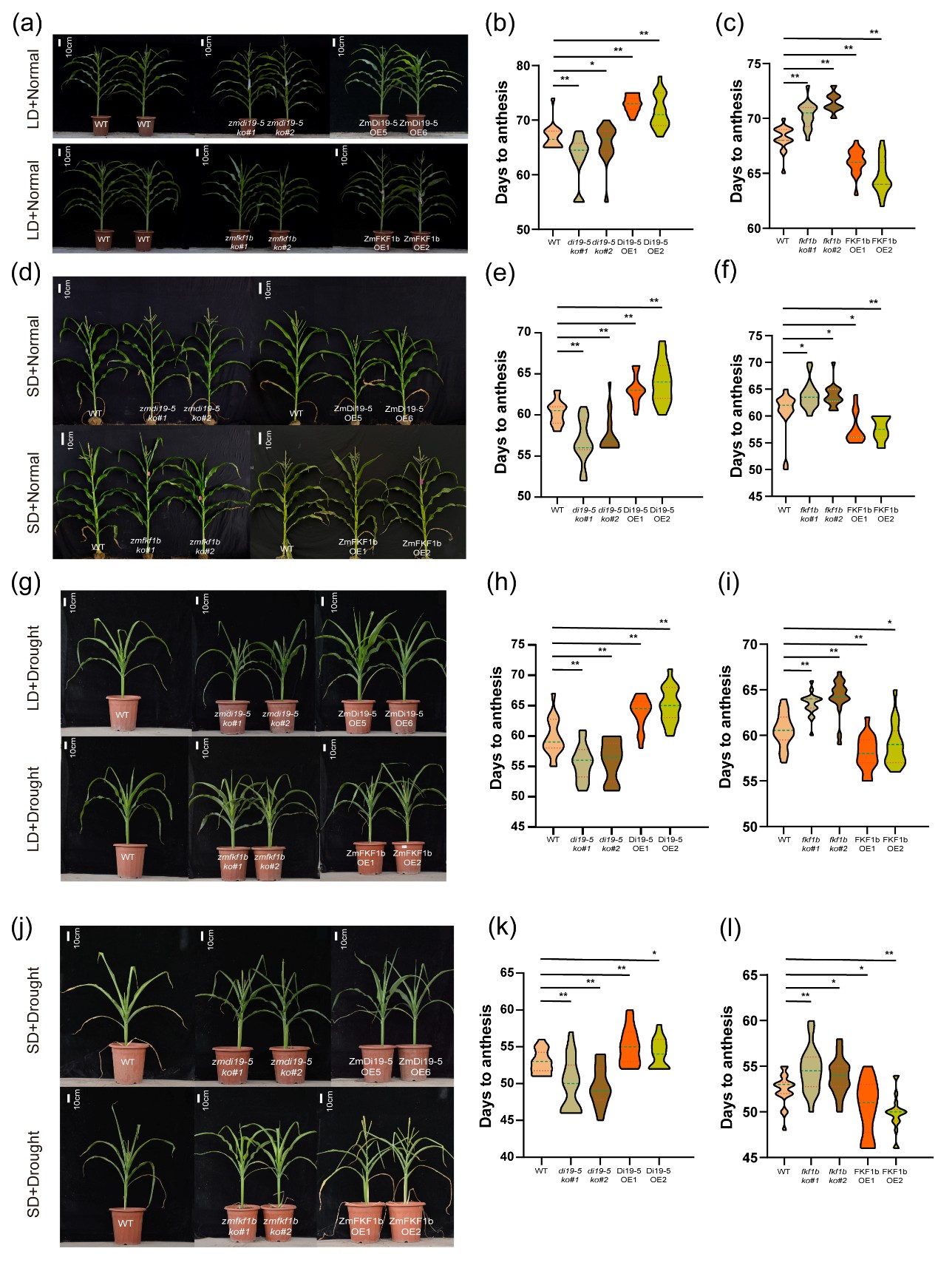 zmfkf1b突变体则开花延迟,且干旱胁迫会进一步加速所有基因型开花。