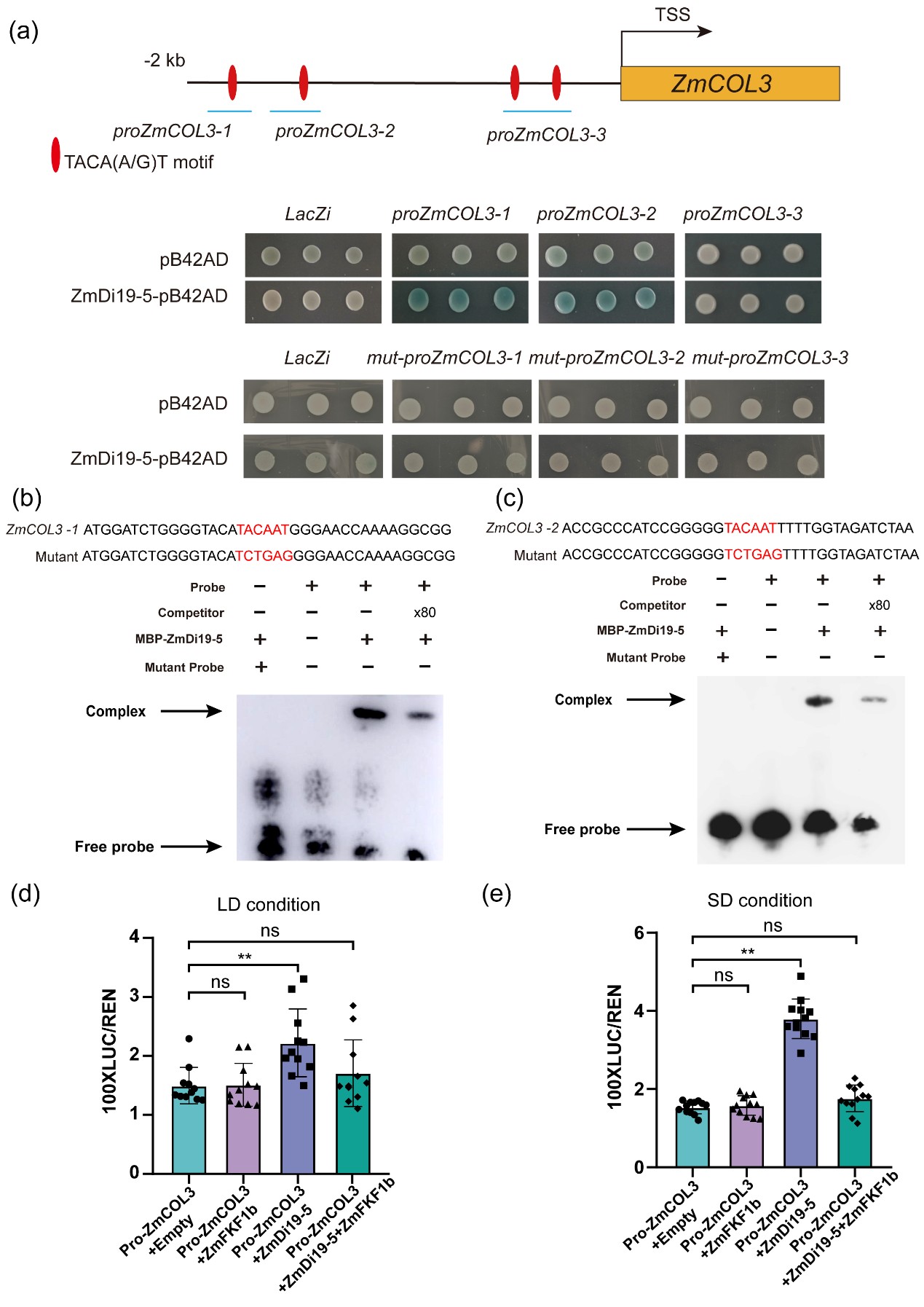 ZmCOL3的启动子区域;随后凝胶迁移实验进一步从体外层面证实,ZmDi19-5可精准识别ZmCOL3启动子中的关键顺式作用元件。功能层面研究显示,ZmDi19-5通过结合