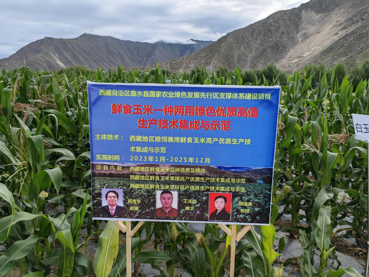 杨青华教授团队在西藏拉萨市曲水县开展西藏粮饲兼用鲜食玉米品种选育、高产优质栽培技术及综合利用的研究。团队核心成员包括王泳超老师、邵瑞鑫老师,硕士研究生杨寒星、杨留洋。