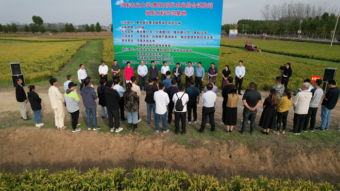 舞阳贾湖遗址是世界水稻发源地之一,9000年前贾湖人已经创造灿烂辉煌的原始稻作农耕文明。自2021年我校(舞阳)现代农业综合试验站成立后,试验站就针对舞阳县泥河洼滞洪区农业生产状况,继承传承贾湖9000年灿烂辉煌的稻作文化,依托贾湖酒业集团在贾湖遗址“旱改水”复种水稻,利用我校在品种和技术方面的优势,首年复种获得成功。今年我校持续加大科技服务力度,入驻专家团队、入驻科研项目、入驻研究生,针对舞阳土壤类型、气候特点及病虫害发生规律,优化示范田实施方案,我校水稻团队李俊周教授带领团队老师及研究生深入田间地头,言传身教,从育苗、插秧、施肥、除草、病虫害防治、收获、稻谷储藏等环节进行技术指导,帮助农户进行科学种植,把技术落到了田间地头。
