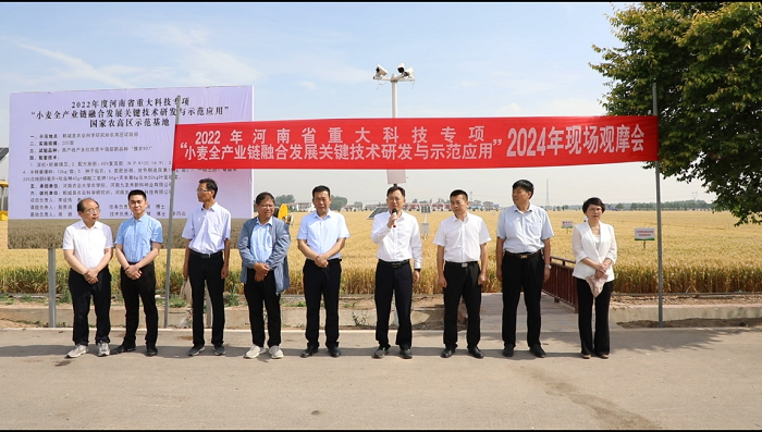 本网讯(通讯员 豆根生 马耕)5月20日,时值“小满”节气,小麦粒饱籽满,麦浪滚滚,丰收在即。河南省重大科技专项“小麦全产业链融合发展关键技术研发与示范应用”科技成果现场观摩会在周口国家农高区举办。校党委书记李成伟、河南省科技厅现代农业农村科技处副处长徐志华,周口国家农高区管委会主任韩卫东、我校成人电影