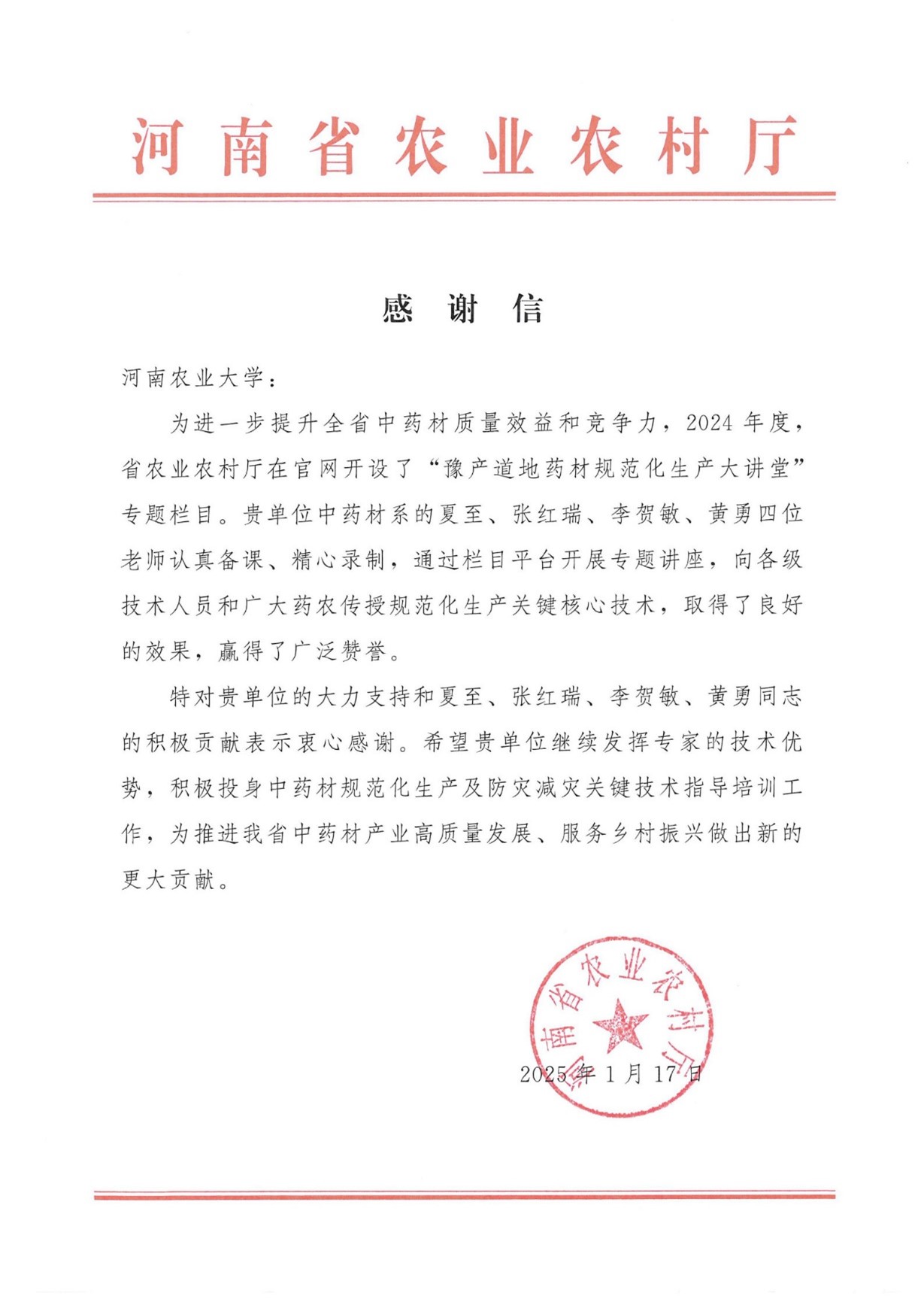 本网讯(通讯员 夏至)新年伊始,万象更新。1月17日,河南省农业农村厅向我校发来感谢信,感谢成人电影