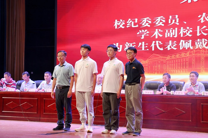 党委书记马菲,学术副校长、院长王道文,为新生代表佩戴成人电影