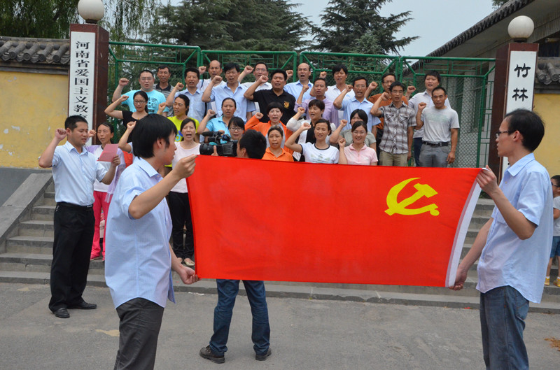 在爱国主义教育示范基地前,全体党员面对鲜艳的党旗,庄严的举起右手,重温了入党誓词。