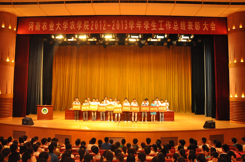 2012-2013学年学生工作总结表彰大会在校大礼堂隆重召开。校党委副书记、纪委书记杨德东,校教务处处长何松林、招生就业处处长张留占、学生处副处长张红阳、校团委副书记马菲出席,院党委书记黄松、院长林同保、副书记贾磊、副院长杨青华、杨百黎及全院在校本科生、研究生参加了大会。会议由院党委副书记贾磊主持。