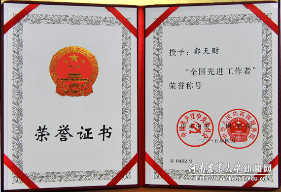郭天财教授“全国先进工作者”荣誉证书