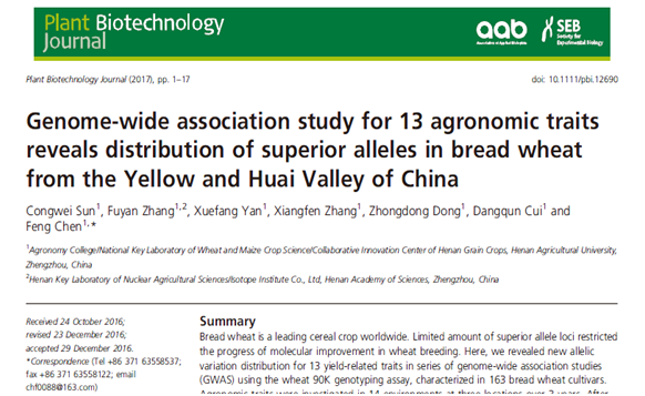 陈锋教授科研团队在植物学领域知名期刊Plant Biotechnology Journal(SCI影响因子6.09)上发表一篇题名为Genome-wide association study for 13 agronomic traits reveals distribution of superior alleles in bread wheat from the Yellow and Huai Valley of China的学术论文。成人电影