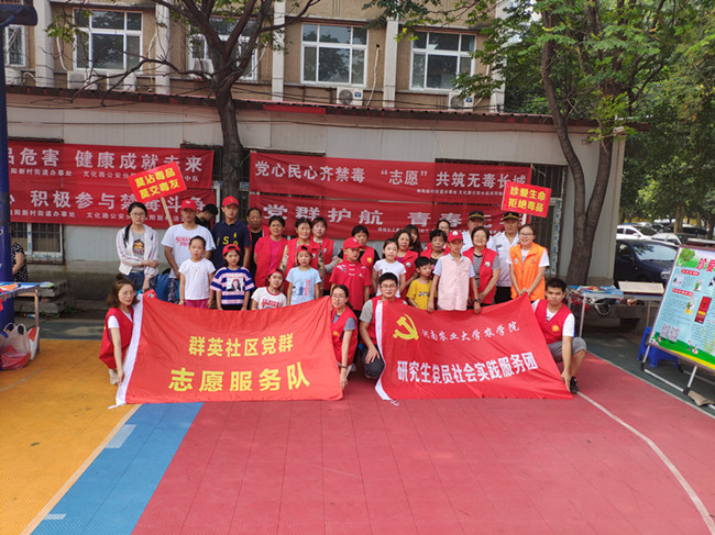 研究生党员社会实践服务团联合绿城社工服务站、南阳新村街道办事处、文化路公安分局南阳新村治安中队、群英社区党群志愿服务队等多家单位举办“党群护航,青春无毒”为主题的识毒、禁毒宣传活动,加深广大青少年对毒品的了解,增强全民禁毒意识。