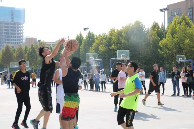 篮球场上,18级研究生新生按专业班级进行了一场别开生面的友谊赛。赛场上,选手们斗志昂扬,奔跑着运球,传球,投篮,比赛十分激烈,整个赛场上掌声,欢呼声,呐喊声此起彼伏,只见场上队员时而转身跳投,时而三分远投,他们身行矫健,动作挥洒自如,成为了一道亮丽的风景线。
