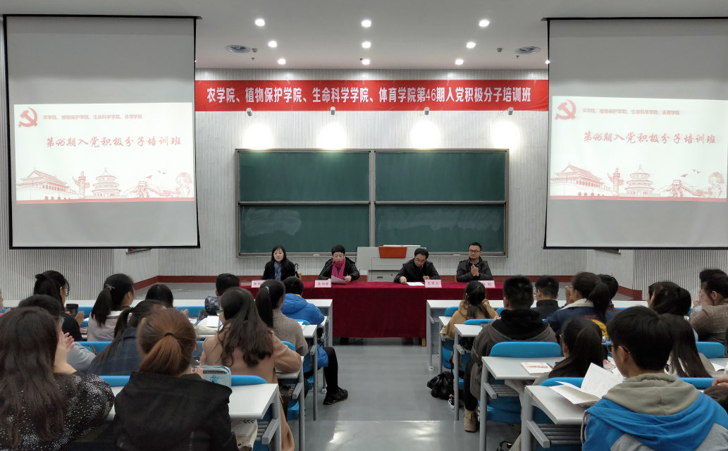 、植物保护学院、生命科学学院、体育学院第46期入党积极分子培训班开班,来自四个学院的四百余名入党积极分子参加此次培训。