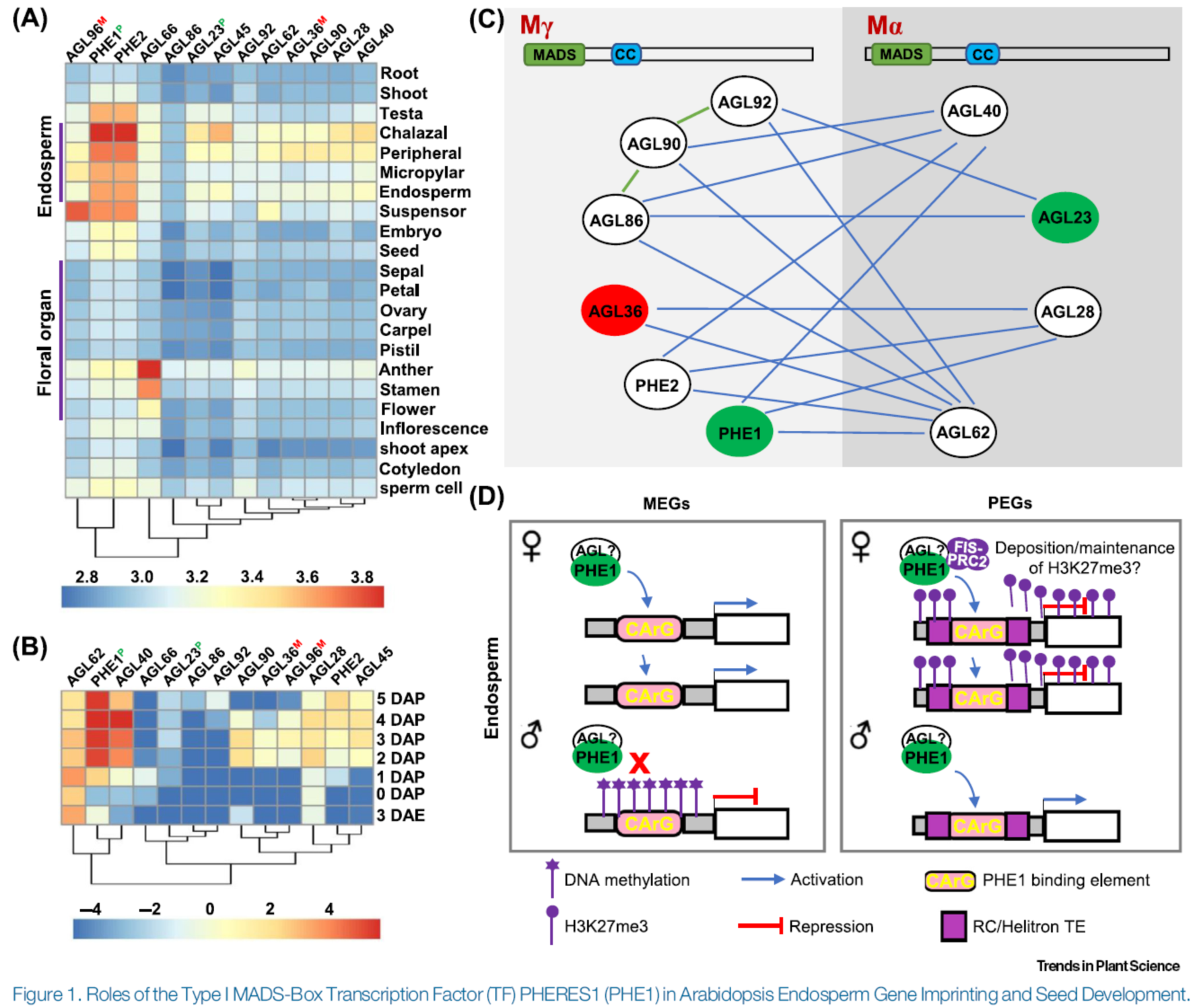 近年来,各种开花植物中已鉴定到几十到几百个印记基因。而这些印记基因富集的功能类别在不同的植物中相似性较低。尽管如此,仍有一定数量的印记基因在双子叶和单子叶植物中功能保守。特别是一些母本印记基因,它们一般都参与生殖发育。相比之下,几乎所有的拟南芥父本印记基因均不影响二倍体种子的发育。有趣的是,一部分拟南芥父本印记基因参与建立不同倍性杂交生殖障碍[3]。而PHE1通过结合邻近转座因子控制下游印记基因的表达,揭示了I型MADS-Box转录因子在胚乳细胞化过程中的功能。具体的,PHE1 通过对母体或父本等位基因进行不同的表观遗传修饰,从而激活或阻止相应的等位基因,实现了PHE1对印记基因的精准调控。对母本表达印记基因而言,PHE1的结合位点在父本等位基因上被甲基化,而母本等位基因没有被甲基化,从而使PHE1特异结合并激活母本等位基因;对父本表达印记基因而言,PHE1均可以与母本和父本等位基因结合,但由于母本等位基因被抑制性的H3K27me3修饰,PHE1仅可以结合并激活父本等位基因。此外,I型MADS-Box转录因子通常以异源二聚体的形式增加结合DNA的特异性参与种子早期发育。该评论指出了可能存在的I型MADS-Box转录因子的互作组合以及PHE1-AGL62二聚体共同参与调控胚乳细胞化。