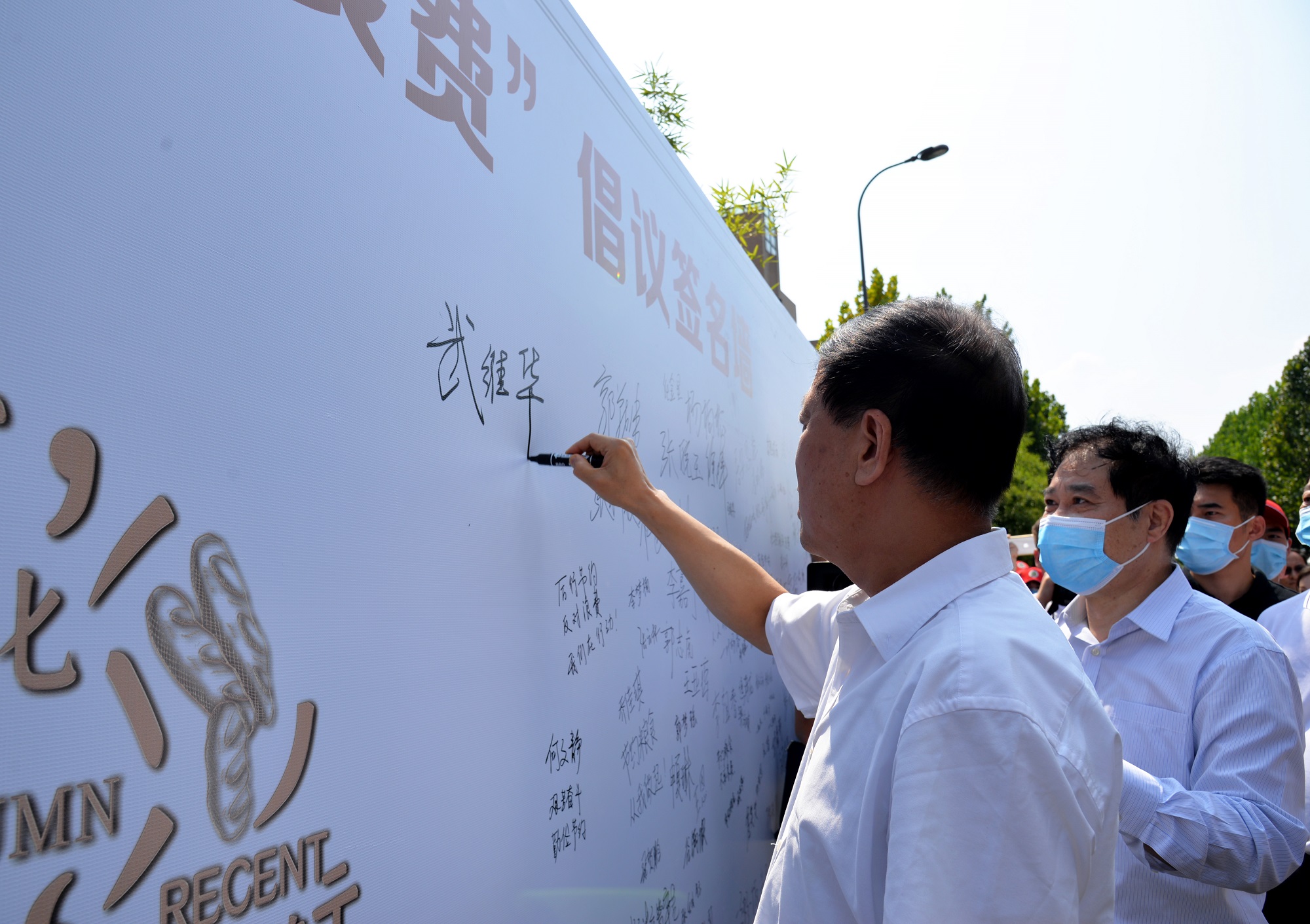 武维华在签名墙前进行签名