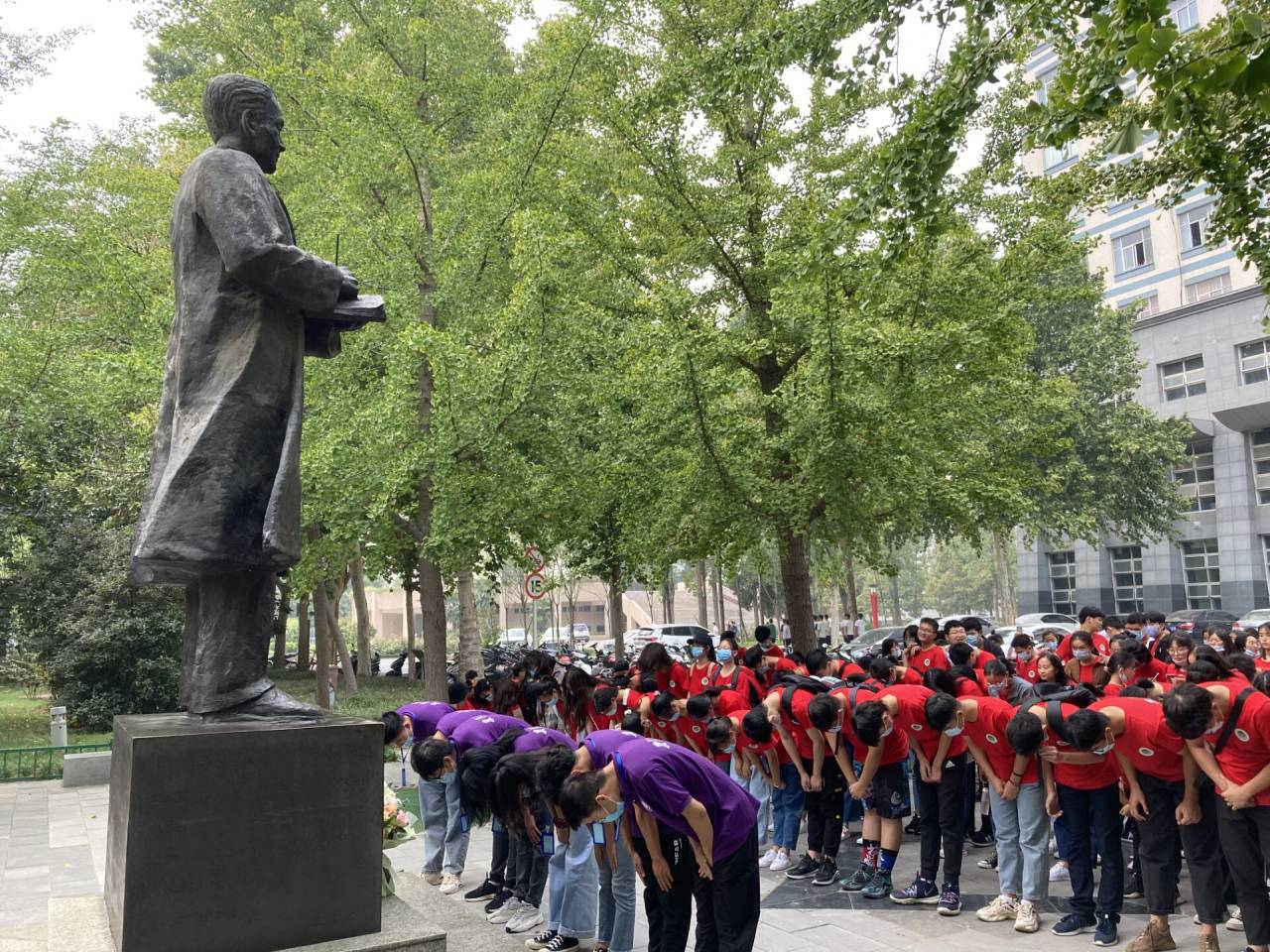同学们向吴绍骙雕像献花致礼