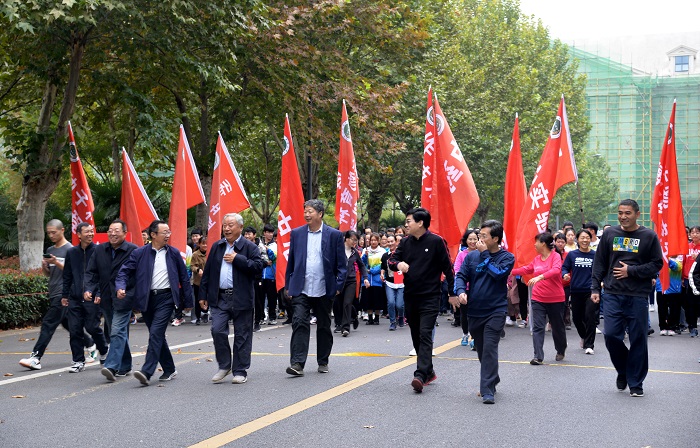 下午3时许,龙子湖校区第一实验楼南门前道路上红旗迎风招展,参赛师生整装列队,蓄势待发。“活动开始!”随着校党委委员、院党委书记郭战伟的一声令下,参赛师生如潮水般出发,沿着美丽的龙子湖校区内规定好的路线有序行进,走了2圈、约5公里的路程,历时近1个小时。浩浩荡荡的队伍、井然有条的秩序、意气风发的面庞,大家精神抖擞、笑语连连、甩开臂膀、迈开大步,享受着运动带来的愉悦,品味着健康生活的好心情,用实际行动诠释着“快乐工作,健康生活”的理念,成为校园里一道亮丽的风景线。