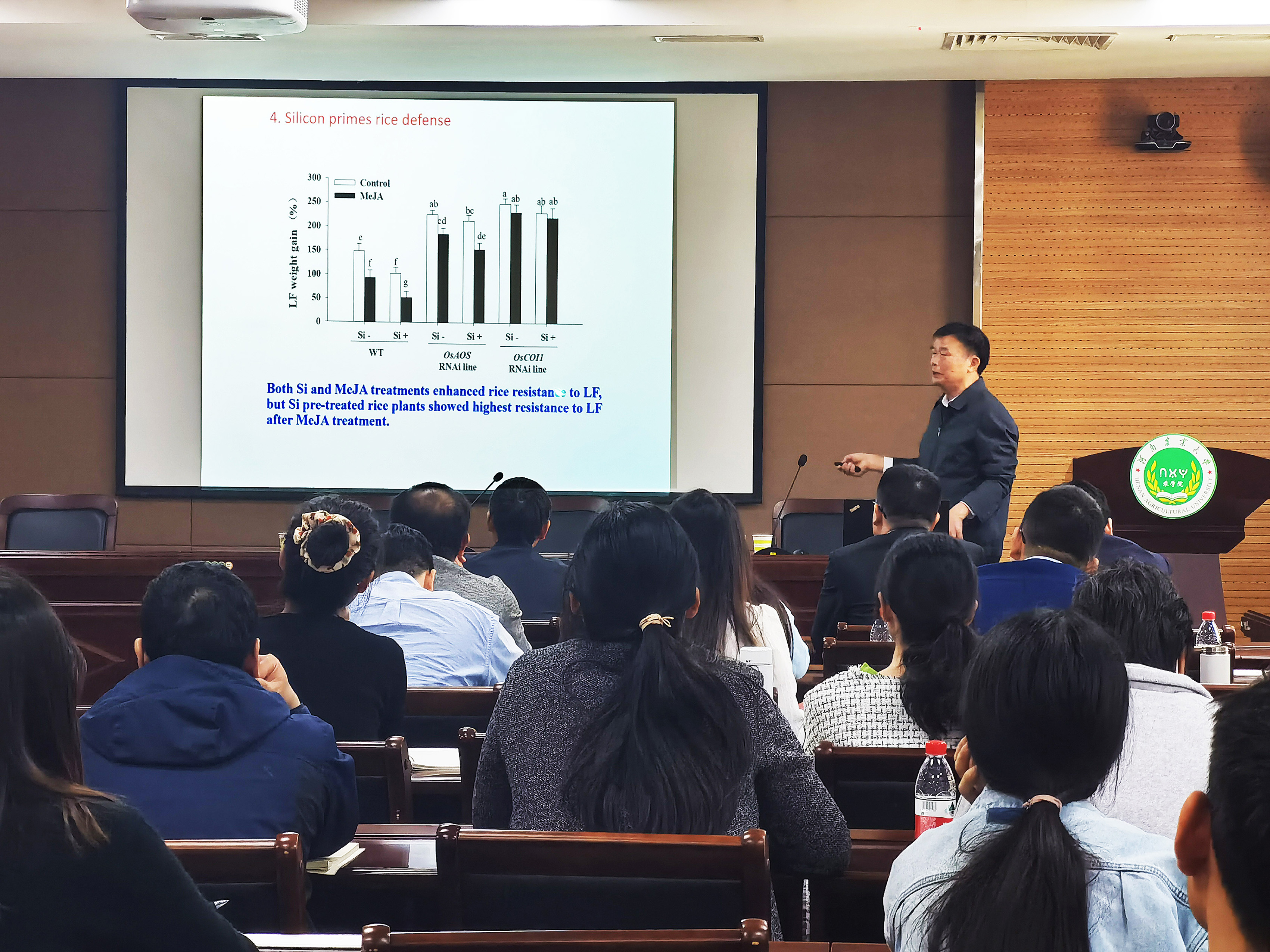 曾任森教授首先以水稻为例,介绍了水稻中二萜化合物的生态学功能以及有益微生物对作物抗性的诱导与警备作用,揭示了植物警备防御机制的重要性;接着从菌根菌丝网络参与植物间防御信号的化学通讯、硅对水稻抗虫性的警备和水稻对害虫取食的记忆三个方面,详细介绍了植物感知信号抵御病虫害的过程;最后以野生型番茄HIPS与斜纹夜蛾幼虫之间的生存关系为例,向大家具体介绍了昆虫的反防御策略。