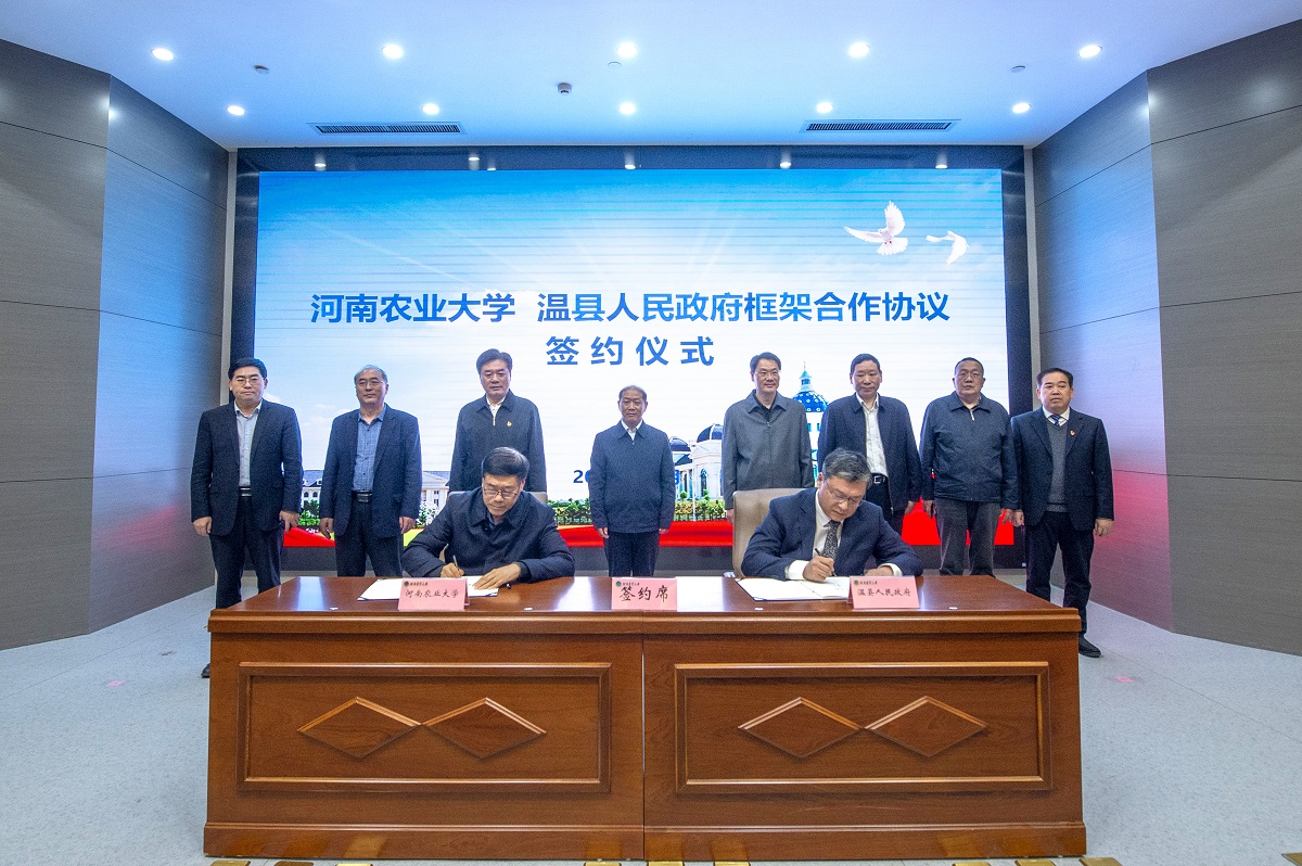 、温县人民政府现场签署框架合作协议。双方将通过建立温县小麦产业研究院、怀药产业科技创新平台,探索构建校地企合作培养人才模式,实现强强联合、优势互补、合作共赢,进一步推进产教融合、科教融合,提升学校“四个服务”能力,为温县现代农业高质量发展奠定坚实基础。