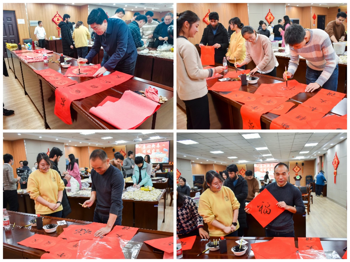 点带起笔、中锋铺毫、藏锋收笔……毛笔字优美的线条和造型引得师生纷纷围观。师生们挥毫泼墨,红底黑字的春联,似蛟龙出海,狂凤起舞,洋溢着中华民族特有的红色喜庆和春意。