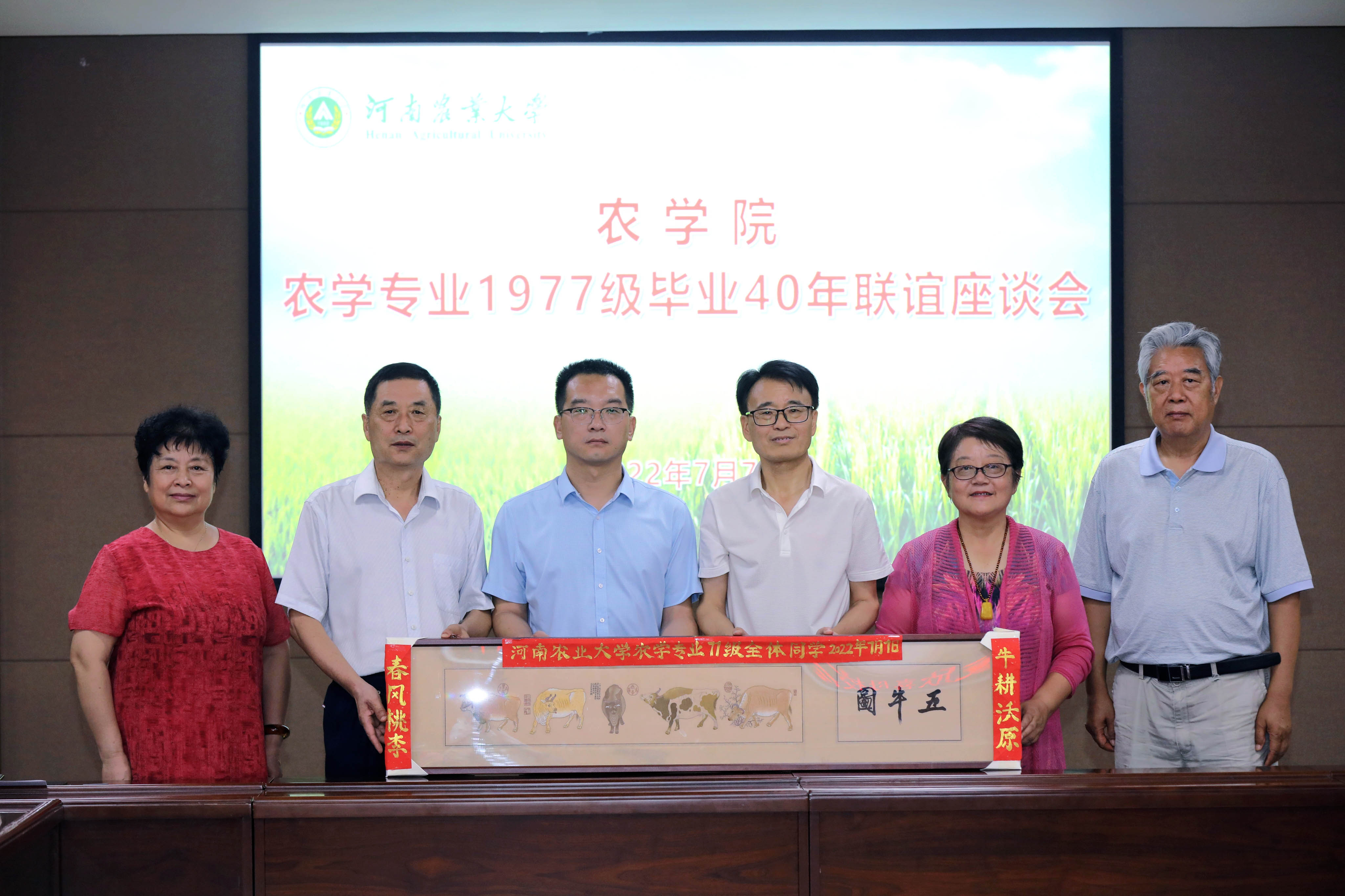 张琼、王凌、赵德新、郭振旺代表农学专业77级全体毕业生向学院赠送“五牛图”,寓意“牛!牛!牛牛牛!”。张琼、王义波等77级校友依次发言,分别回顾了自己的学习、工作经历,感恩、感谢母校的教育培养,分享了人生感悟,并对学科建设、专业建设、校企合作、发挥校友资源优势等提出了意见建议。