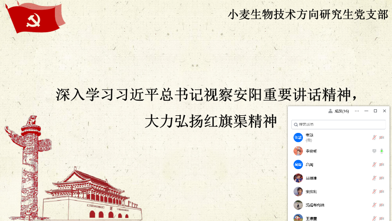 小麦生物技术方向研究生党支部认真组织召开“深入学习习近平总书记视察安阳重要讲话精神,大力弘扬红旗渠精神”专题组织生活会暨“学习红旗渠精神,谱写新时代篇章”党日活动,会议取得了预期效果。