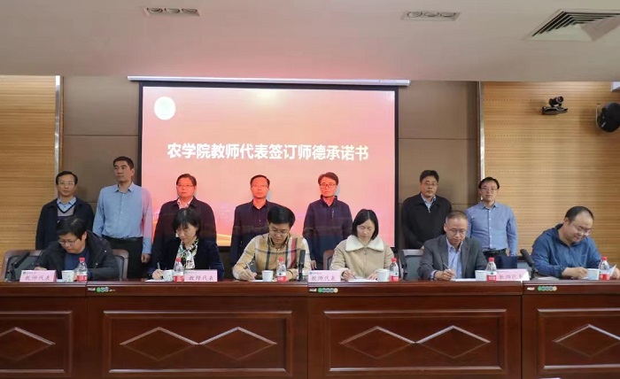 在第一实验楼南321会议室,召开师德师风专题会议暨师德承诺书签订仪式。院领导班子成员、学院全体教职工参加会议。会议由院党委委员、副院长李浩贤主持。