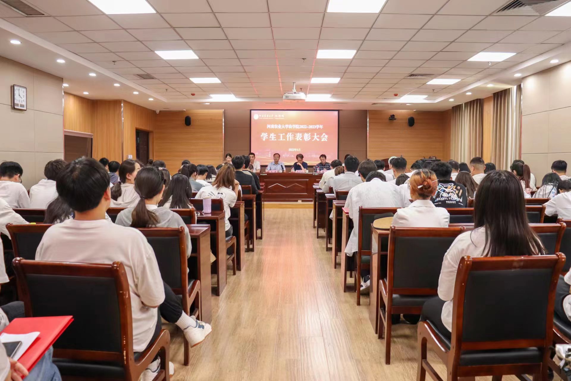 于龙子湖校区第一实验楼南321会议室召开2022-2023学年学生工作表彰大会。学院党政领导班子、院团委负责人、先进集体代表、先进个人代表、本科生和研究生学生代表出席此次会议。会议由院团委书记朱瑞萍主持。
