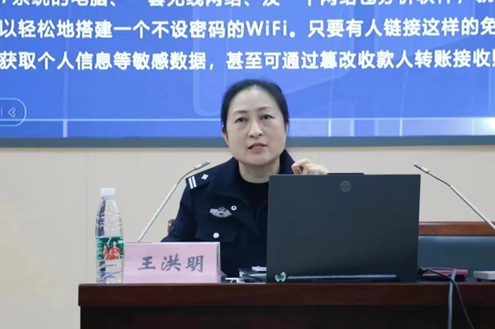 报告会上,王洪明从网络安全、大学生身边的诈骗形式、新型的诈骗技术、电信诈骗技术、电信诈骗的起源与发展、自救措施等方面详细的讲解了电信诈骗的相关内容,以丰富的办案经验和生动的案例分析为与会学生讲解了在校大学生身边常见的诈骗方式及如何辨别与处理,引导学生判断身边常见的诈骗形式。报告会上,王洪明就冒充公检法人员诈骗举了一个女生面临冒充公检法人员诈骗时及时向保安处及警察求助,从而及时识别诈骗的例子,强调了警觉意识和国家安全教育的重要性。现场氛围活跃,与会学生从各种案件中深切认识到了诈骗形式的层出不穷与危害之大。