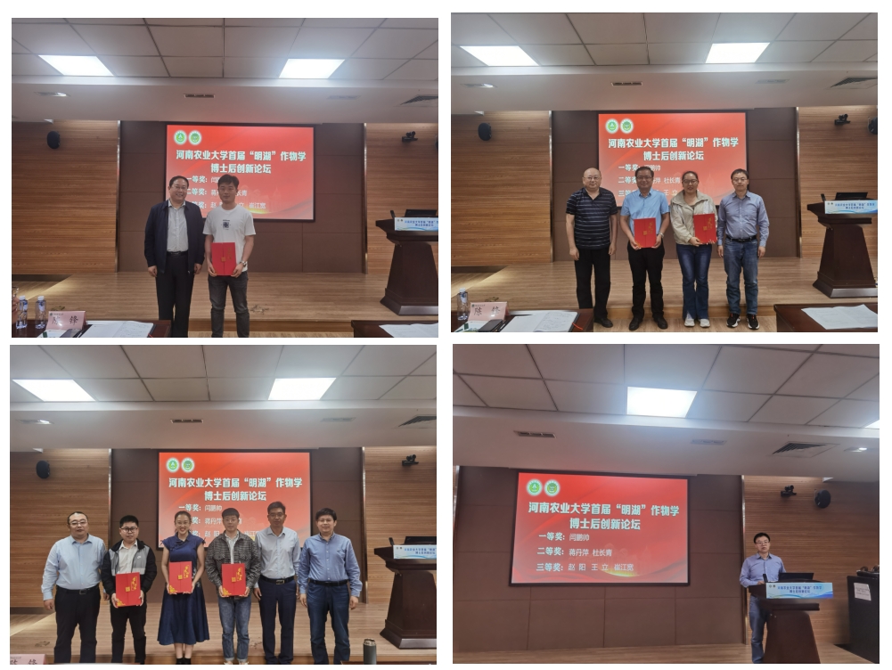 “明湖”创新论坛15名优秀博士后详细介绍了各自研究领域的最新成果及下一步计划,与会专家给予了中肯的评价和建议,与会博士后积极参与交流互动,经过专家评选,流动站站长王志强宣读闫鹏帅《玉米铁营养强化基因的克隆及应用》荣获一等奖、蒋丹萍《秸秆生物质光发酵制氢过程光扰动效应研究》和杜长青《作物E3泛素连接酶OsPIE3平衡抗病性与籽粒发育的分子机理》荣获二等奖、赵阳《生湿面条表面黑点形成及预防机制研究》、王立《氟啶虫胺腈诱导棉蚜再猖獗机制及对非靶标生物的安全性评价》和崔江宽《禾谷类作物孢囊线虫快检技术开发和抗病基因挖掘》荣获三等奖,人事处和与会专家颁发了荣誉证书。