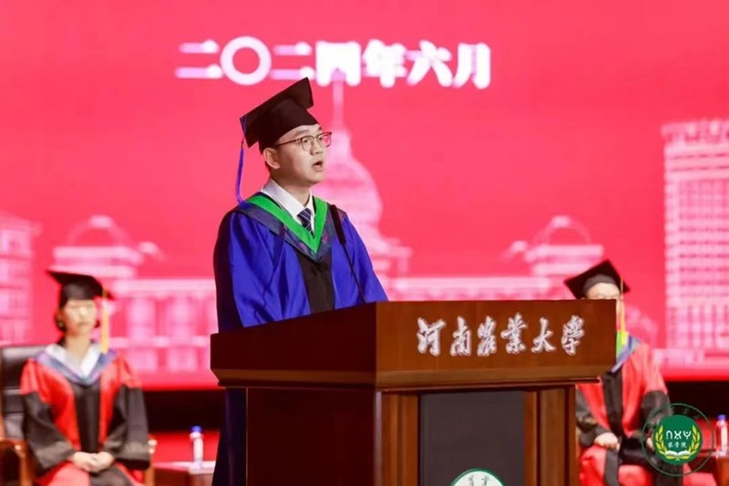 王道文作最后的致辞,他用诚挚的话语回顾了老一辈农大人扎根黄土地,用双手为农作物提质增产,用汗水为农作物保驾护航,用勤劳突破产量的极限,深切地与同学一起回顾了历经疫情洗礼的青葱岁月。并向大家提出三点期望: