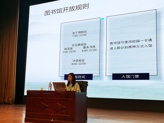 图书馆是大学生重要的学习阵地之一,是大学的文献保障中心、信息服务中心、学术交流中心、校园文化中心。于老师全方位向新生们介绍了各个校区图书馆的基本情况,包括服务内容、信息检索方法、纸质图书借阅规则和开放时间等,让新生对图书馆有了基本的了解,大大方便了新生们的借阅与文化活动。此外,她还介绍了图书馆的数字图书馆、在线数据库、电子期刊等电子资源,使新生们了解到图书馆资源的丰富。最后,于老师对现场学生提出的疑问做出了详细解答并鼓励新生自主进入图书馆探索知识与信息,积极参加图书馆举办的文化活动来充实自己的校园生活。