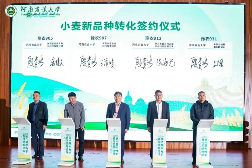 小麦种质创制与新品种培育创新团队殷贵鸿研究员在“2024第八届作物学黄河国际论坛”上,分别与陕西富麦粮丰种业科技有限公司、河南岁盈农业科技有限公司、新乡市金苑邦达富农业科技有限公司、安徽华皖种业有限公司等企业代表现场进行小麦新品种经营权独占签约仪式。本次签约包括豫农905、豫农907、豫农912、豫农931四个小麦新品种,转让经费总计1040万元。