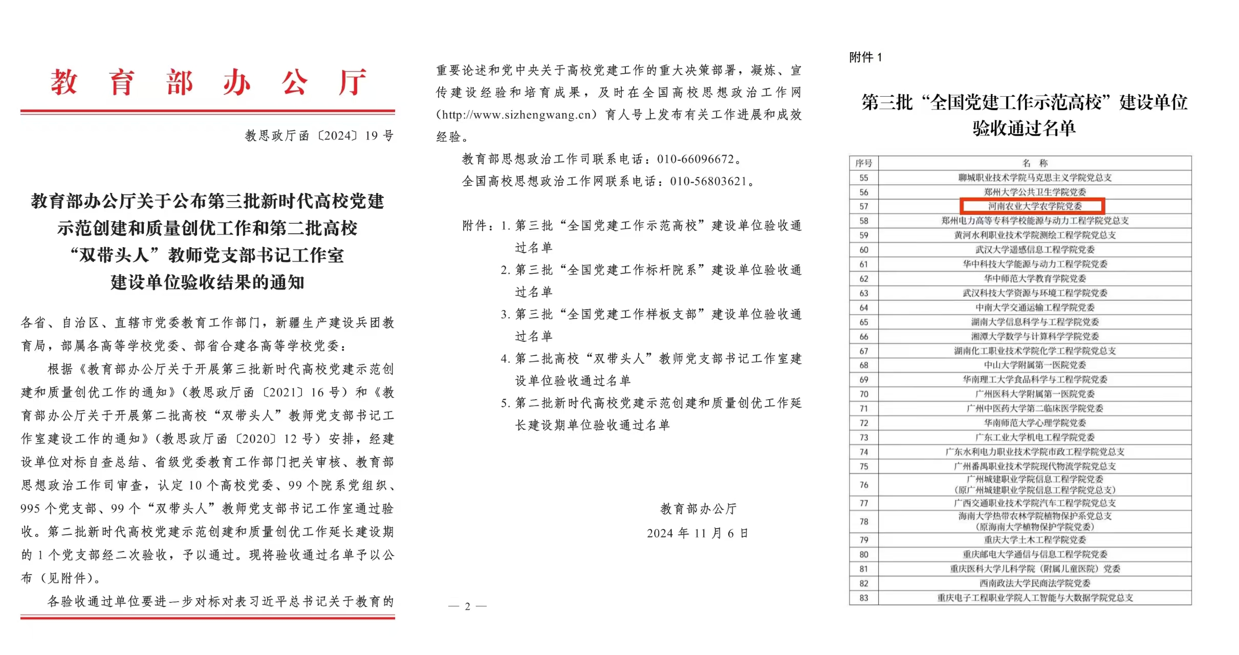 本网讯( 通讯员 李盼)近日,教育部办公厅发布《第三批新时代高校党建示范创建和质量创优工作和第二批高校“双带头人”教师党支部书记工作室建设单位验收结果的通知》,成人电影