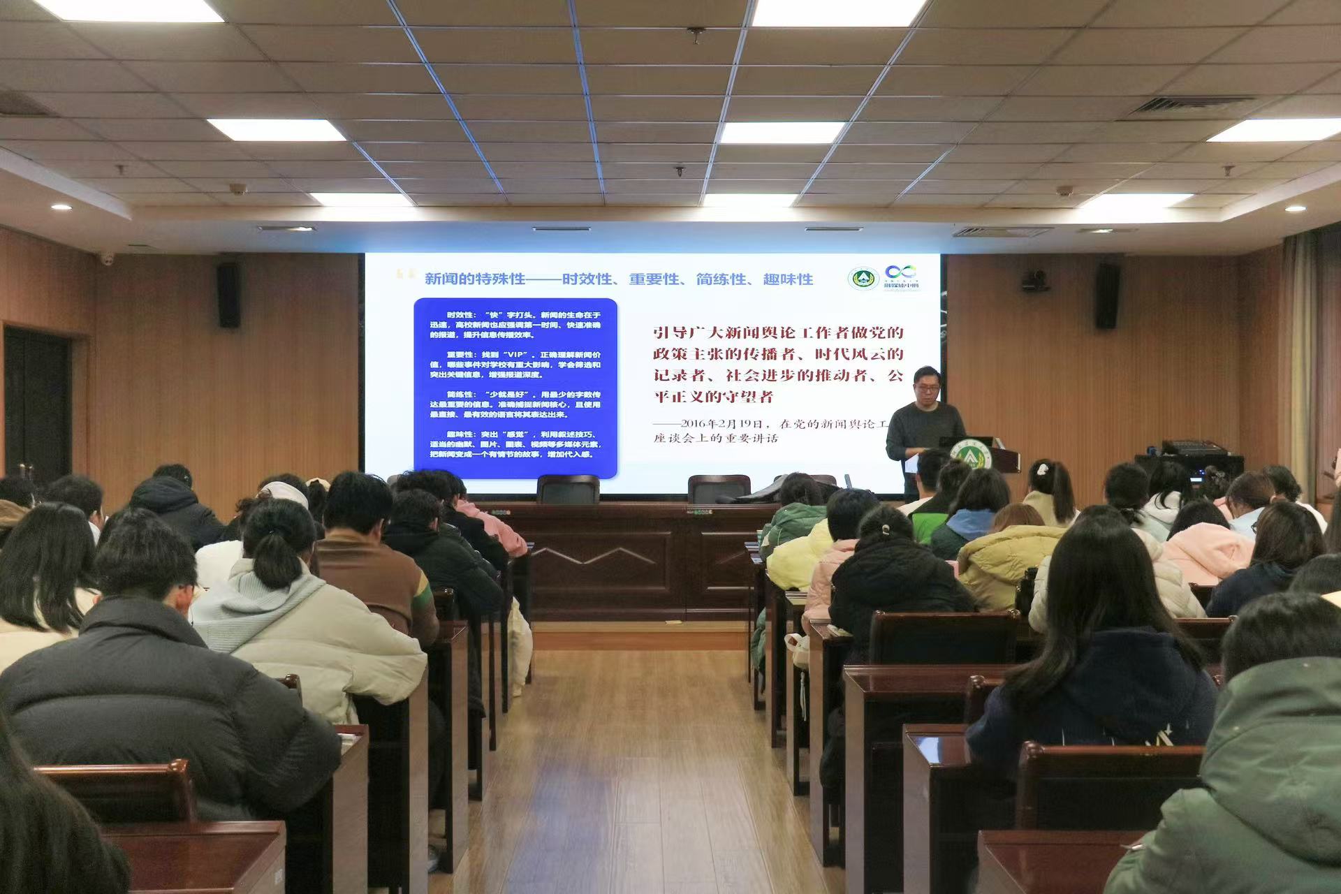 会议伊始,黄璞老师分享了自己在新闻工作中的技巧和心得。他首先强调了宣传工作的重要性,以时间轴的顺序明确了新闻采访的流程。黄璞通过讲述自己的亲身经历,用案例生动有趣地说明了采访中要确认活动安排、提前到达现场、确保信息准确性等注意事项,他表示新闻五要素是新闻报道的核心。在分享拍摄技巧环节他介绍了常用相机的品牌、型号及使用技巧,讲述了新闻摄影“保一张”、“时刻保持相机”、“人物兼顾”的拍摄思想,并对学生分享了会议类、参观类新闻的拍摄技巧,干货满满,学生们受益匪浅。最后,他分享了“内容为王,创新为要”的新媒体工作思路。他希望学生做到:要聚焦要点热点,主动担当靠前站位;聚焦农业特色,打造“助农天团”金字招牌;聚焦典型选书屋,讲好农大故事;聚焦传媒风口,创新传播形态;要以新闻之力,让校园更美好!黄璞老师以幽默风趣的语言从高校新闻的采写和发布,摄像基础知识与高校各类活动拍摄技巧,高校新媒体、短视频创作三个方面分享了自己在新闻工作中的技巧和心得。