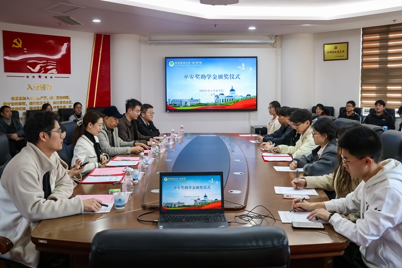 于龙子湖校区第一实验楼南222会议室举行“平安奖助学金”颁奖仪式。河南平安种业有限公司总经理吕庆丰、院党委副书记方芳、正科级组织员李盼、院团委副书记唐朝、院团委老师杨航、院研究生辅导员赵倩男和25位获奖学生参加仪式,会议由院团委副书记唐朝主持。