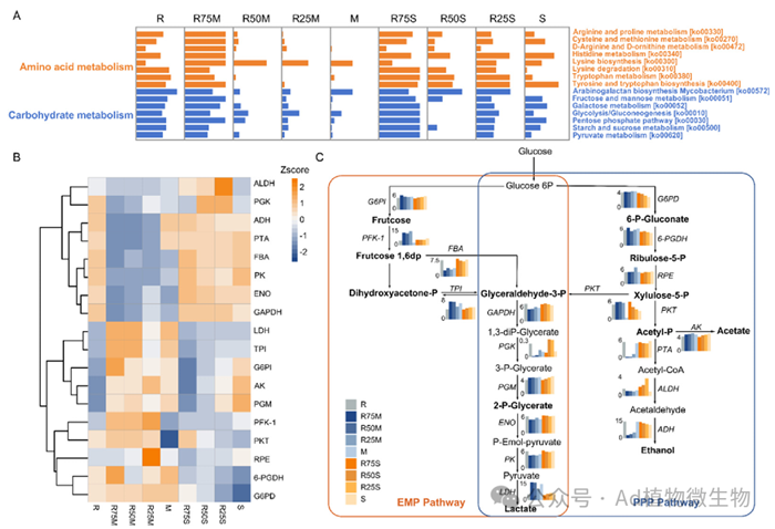 本研究通过混合青贮技术,将FGR与玉米或高丹草按不同比例(75:25、50:50等)进行共发酵,结合代谢组学与微生物组学分析,揭示了FGR与玉米混合青贮的发酵机制及品质调控规律。研究发现,FGR与玉米以75:25比例混合时,中性洗涤纤维(NDF)和酸性洗涤纤维(ADF)含量分别降至44%和24%,乳酸浓度达39.37 g/kg DM,显著优于与高丹草混合组。玉米的碳水化合物补充与缓冲能力有效调节了发酵环境。混合体系富集了乳杆菌科和芽孢乳杆菌科等有益菌群,抑制了有害微生物增殖。接种植物乳杆菌可进一步提升乳酸/乙酸比至3.5,pH稳定在4.0以下,显著增强青贮稳定性。研究阐明了FGR-玉米混合体系通过微生物实现纤维素高效降解的代谢网络,为精准调控青贮发酵提供了理论依据。