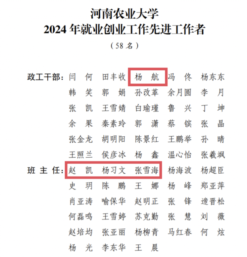 荣获2024年就业创业工作先进单位,杨航、赵凯、杨习文、张雪海四位老师获评就业创业工作先进工作者,以专业服务助力学生高质量就业。