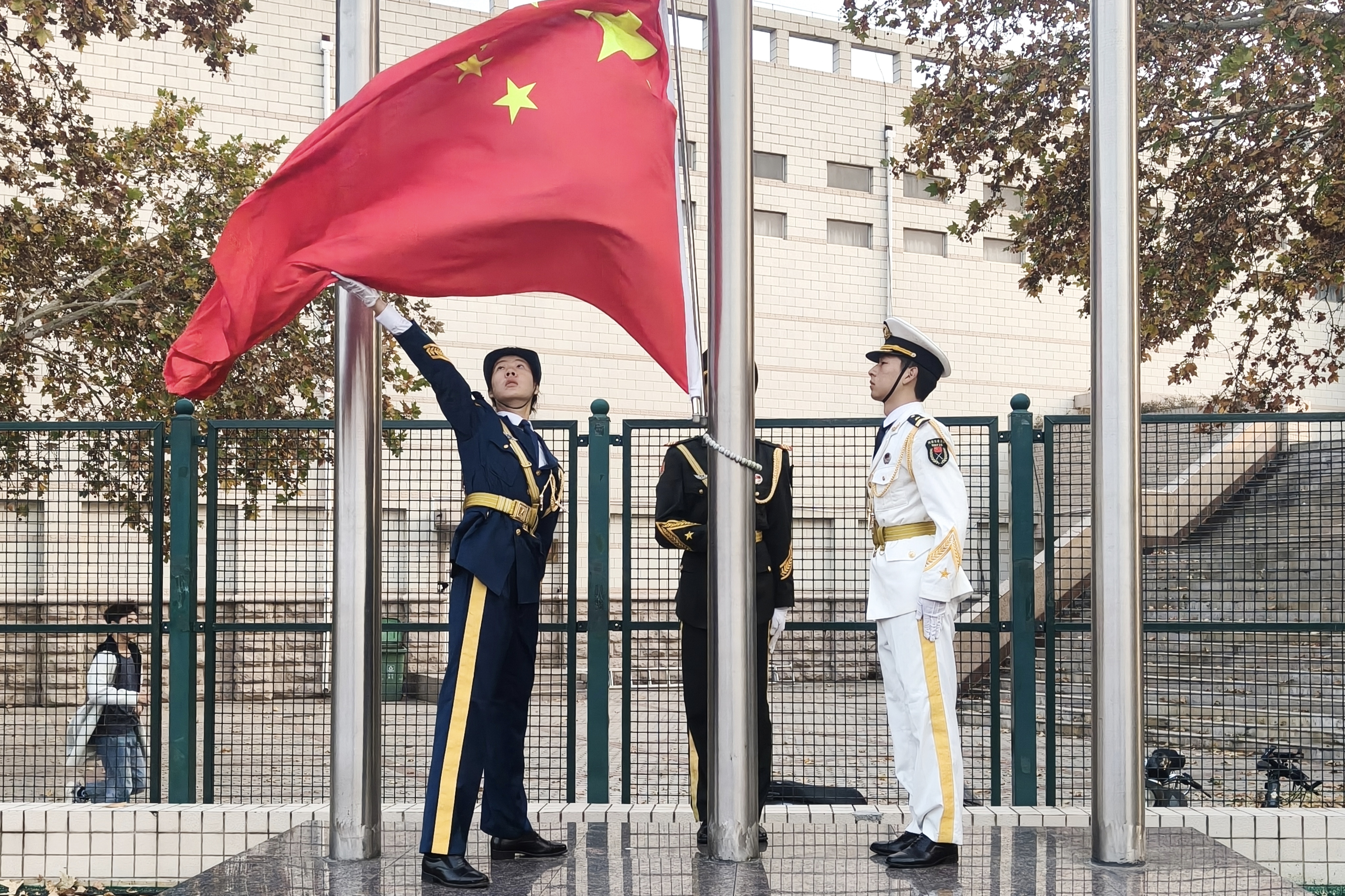晨曦微露,朝阳初升,伴随着雄壮激昂的《义勇军进行曲》,五星红旗迎着晨光冉冉升起,现场全体人员行注目礼,爱国之情与奋斗之志在心中激荡。